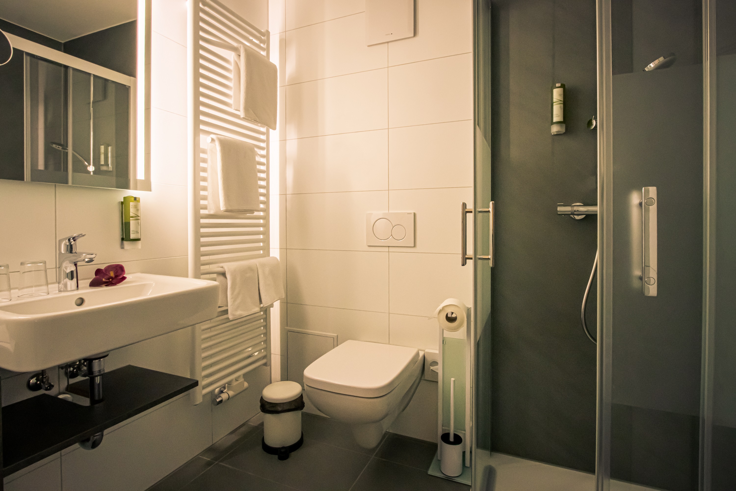 Unsere neu ausgestatteten Komfortzimmer bieten frisches Wohndesign und Gemütlichkeit in einem. Naturbelassene Farben, warmes Licht und die Holzoberflächen verbreiten eine Wohlfühlatmosphäre. Die Zimmer sind mit einem kuscheligen Teppich versehen, ein paar Zimmer haben einen allergiefreien Designbelag. Das stilvolle Badezimmer verfügt über eine ebenerdige Dusche.